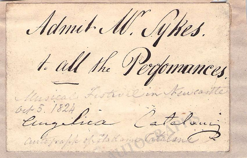Signed pass "to all performances" attached to a slightly larger clip from an album.  Pass has pencil marks by another hand, indicating it corresponds to the New Castle Musical Festival (October 5th, 1824).  Total size is 5 x 3.25 inches, in very good condition.