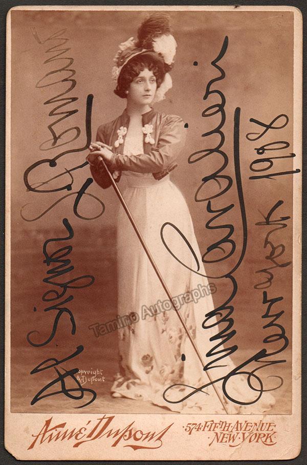 Gorgeous cabinet photo, inscribed and dated in New York in 1908. Size is 4.25 x 6.5 inches, a photo by Aimee Dupont, New York, minor crease over the lower right corner, otherwise in excellent condition.