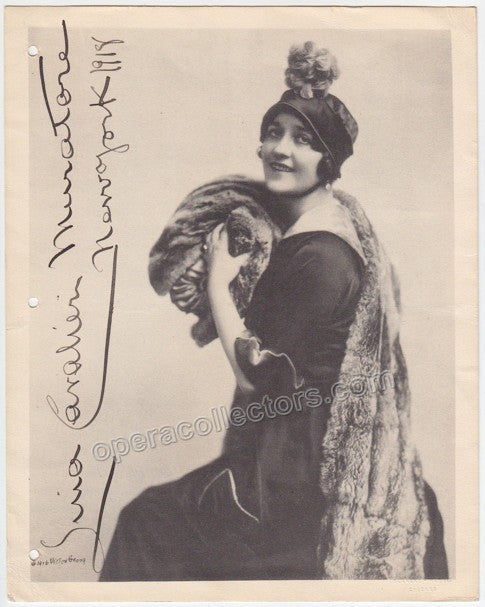 Italian soprano (1874-1944), known for her beauty. Signed photo, 8 x 10 inches, dated in New York in 1918. Photo has mounting holes on the side, not affecting the signature or the image, otherwise in excellent condition