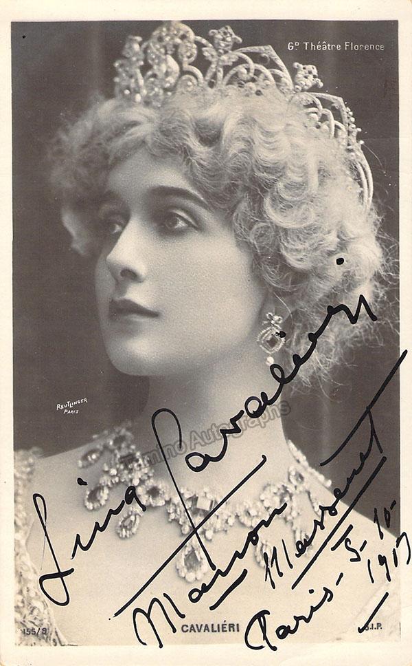 Star Italian soprano, actress and monologist (1874-1944), a major star of early twentieth century opera in both Europe and the United States, widely celebrated for her beauty and talent. Signed photo postcard, shown in title role of Massenet's Manon. Signed in Paris, dated 1917. Blind stamped by photographer Reutlinger, Paris. Size is 3.5 x 5.6 inches with some wear on edges but otherwise excellent condition.