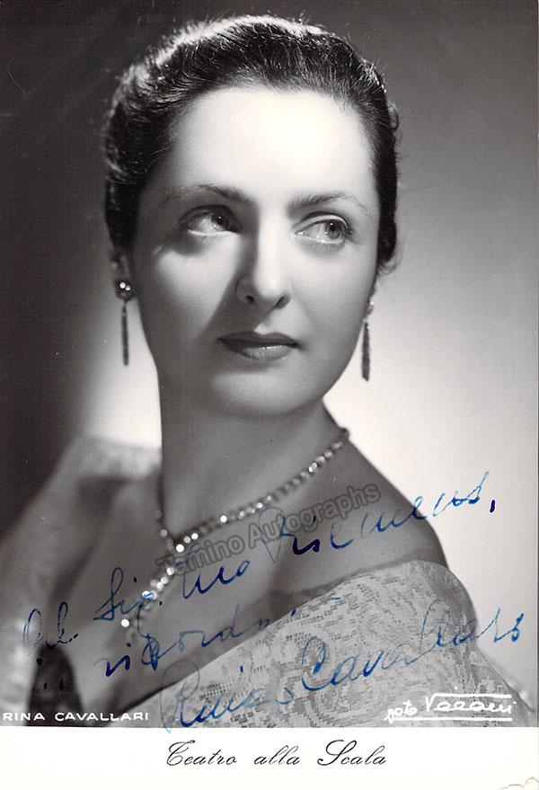 Italian mezzo-soprano (1914-2014), signed photo, shown as herself. Inscribed to Leo Riemens. Blind stamped by photographer Villiani, Bologna. Size is 4 x 5.75 inches, in excellent condition.
