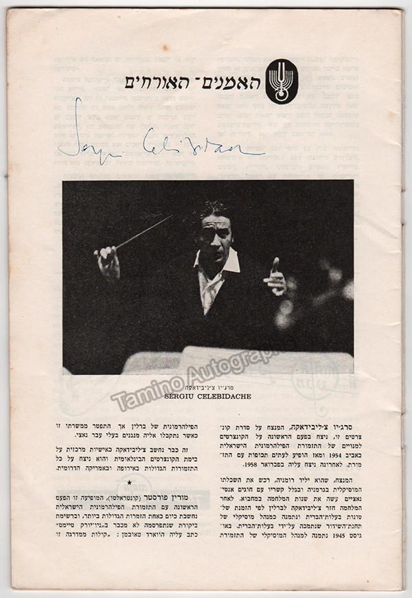 Program with the Israel Philharmonic Orchestra, season 1960-61, Celebidache conducted music by Haydn, Brahms, Prokofiev. Signed by Celebidache in the bio page. Full program, size is 6.5 x 9.5 inches