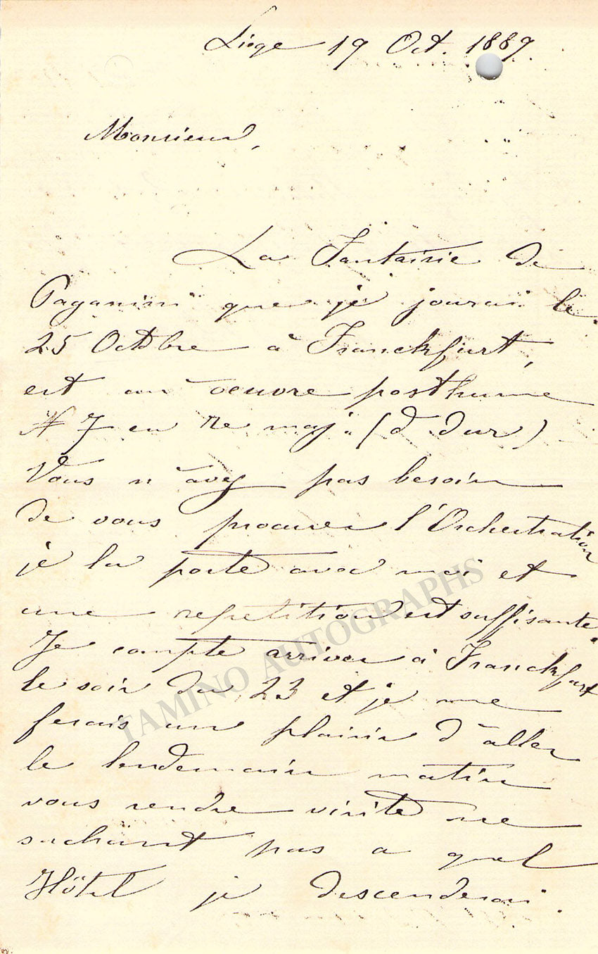 Autograph letter in French signed by him, dated in Liège, Oct 1869 commenting about Paganini's works for violin. Size is 2.8 x 4.5 inches, two written pages in one folded sheet, translation not included, storage holes, in very good condition.