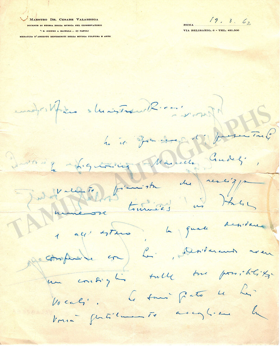 Autograph letter in Italian signed by him and dated 1962, addressed to a certain maestro Ricci recommending a pianist named Marcella Candeli. Size is 9 x 11 inches approx., 2 written pages, personal letterhead above, central fold, some dirt stains, in overall very good condition.