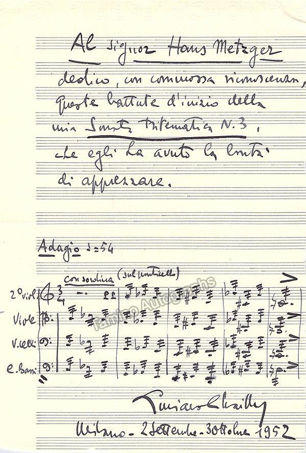 Autograph music quote with 5 bars from his "Sonata Tritematica 3", signed by him, dated in Milan 1952.  Size is 6.4 x 9.4 inches, folds, in very good condition.