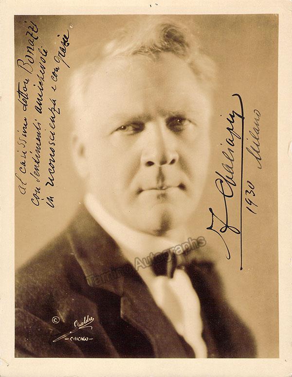 Star Russian bass (1873-1938), possessor of a large, deep and expressive voice, he enjoyed an important international career at major opera houses and is often credited with establishing the tradition of naturalistic acting in his chosen art form. Large signed photo, shown as himself, inscribed with sentiment in Italian in Milan, dated in 1930. Bold handwriting and signature. Photo by Gueldre, Chicago. Size is 7 x 9 inches, very small bullet holes at top and bottom, otherwise in excellent condition.