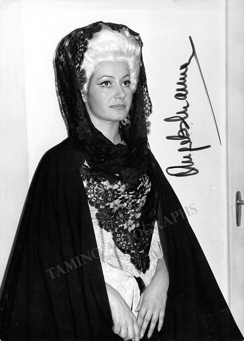 Spanish soprano (b. 1937), signed photo, shown in title role of Giordano's Fedora. Stamped on verso by  photography studio Laboratorios Alfram, Barcelona. Size is 5 x 7 inches, in very good condition.