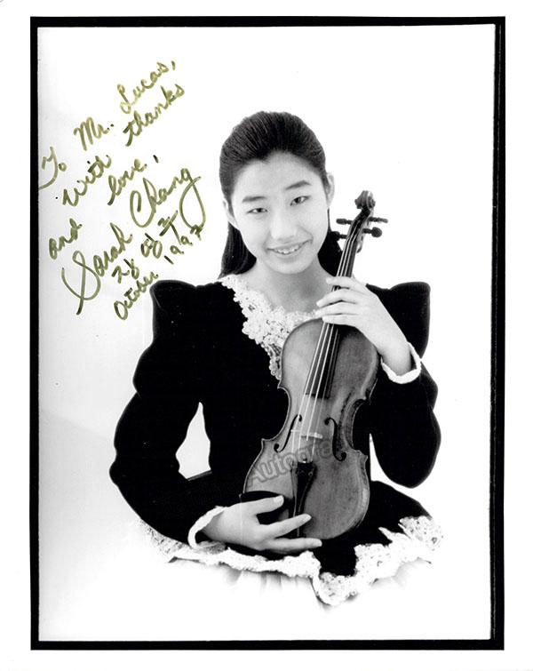 American classical violinist (b.1980), child prodigy who performed for the first time with the New York Philharmonic at age 9. Lovely signed photo, at age 17, inscribed. Size is 8 x 10 inches, in excellent condition.