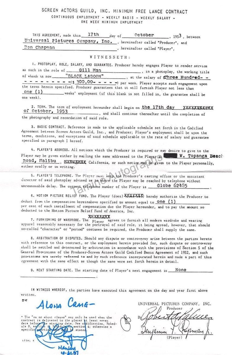 ALSO INCLUDED is a 1-page copy of the contract for his performance as the Gill-man on land, signed by him.  Size is 8.5 x 13 inches, central fold, in very good condition.