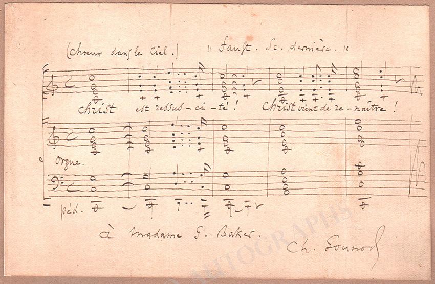Beautiful autograph music quote from "Faust", his most famous work, signed an inscribed by him below, on a album page mounted with a vintage photo of the composer. Gounod writes 5 bars from Faust´s finale, with lyrics, indicating that this part belongs to a chorus from heaven, located outside the stage, singing "Christ est ressuscite!, Christ vient de renaitre!" (Christ has risen again! Christ is born again!).