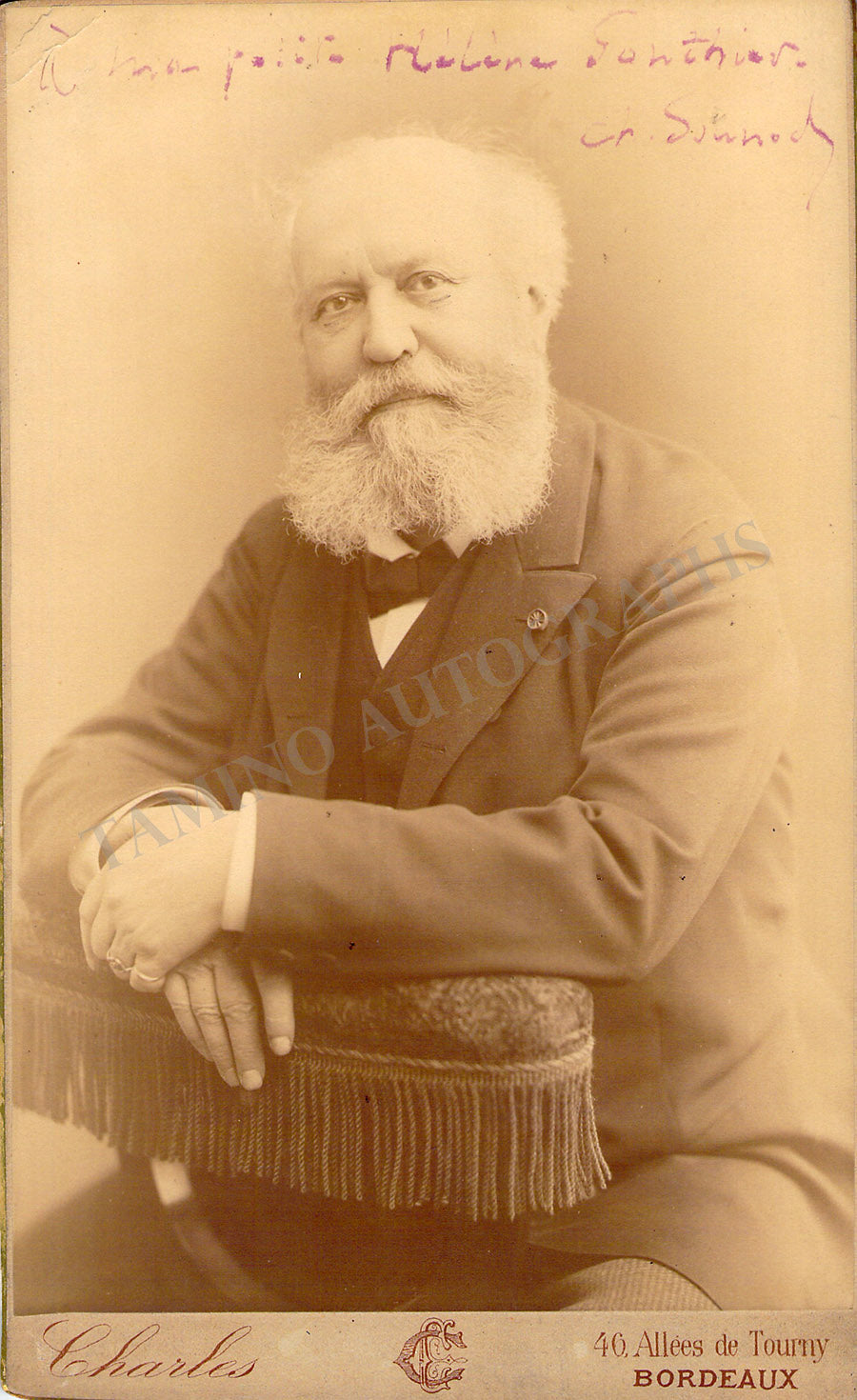 Sepia cabinet photograph of Gounod by photographer Charles (Bordeaux) signed by the composer, mounted on soft white paper.  Size is 5.2 x 8.6 inches, gilded edges, minor crack over the upper-left corner, otherwise in excellent condition.