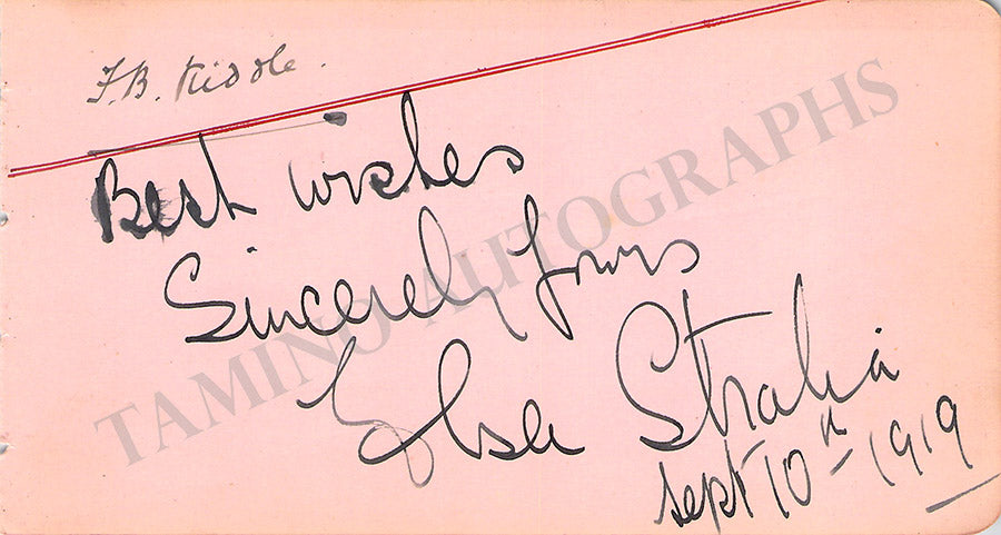 Album page signed by him with a 2-bar music quote from his vocal work "Pan" (1904). The album page has three extra signatures belonging to the British bass Norman Allin (1884-1973), the Australia soprano Elsa Stralia (1881-1945) who signed with a short sentiment dated 1919, and another unidentified artist. Size is 6.3 x 3.5 inches, in very good condition.