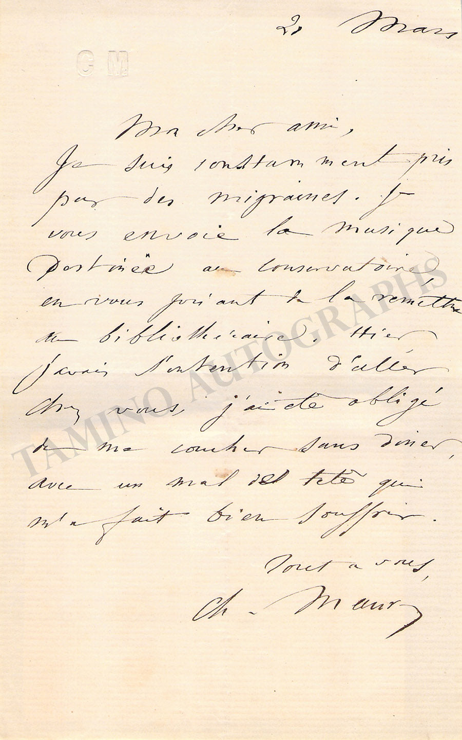 Autograph letter in French (untranslated) with his embossed initials over the top and signed by him. Size is 4.75 x 7.6 inches, 1 page, envelope's flap is glued to the back of the letter, in very good condition.