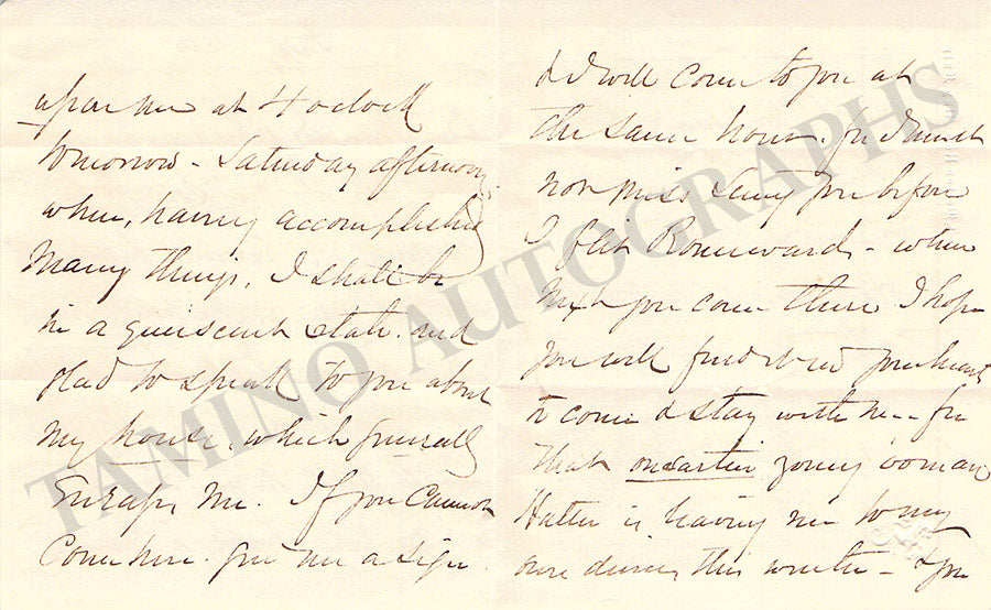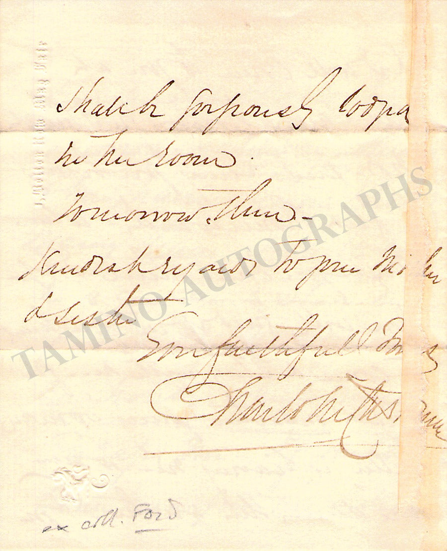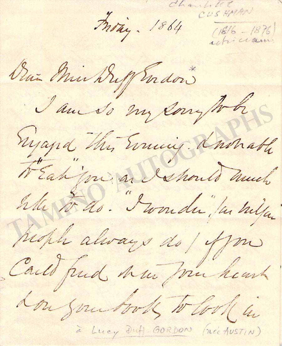Autograph letter in English signed by her, dated 1864, to author Lucy Duff Gordon (1821-1869) providing information on her activities and arranging for a meeting at her place: “...Saturday afternoon when, having accomplished many things, I shall be in a quiescent state and glad to speak to you about my house...”.
