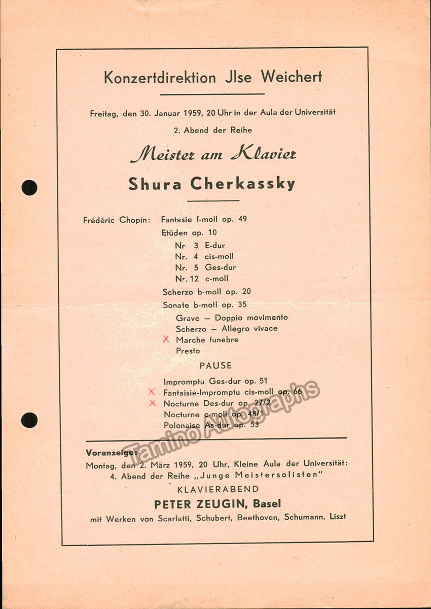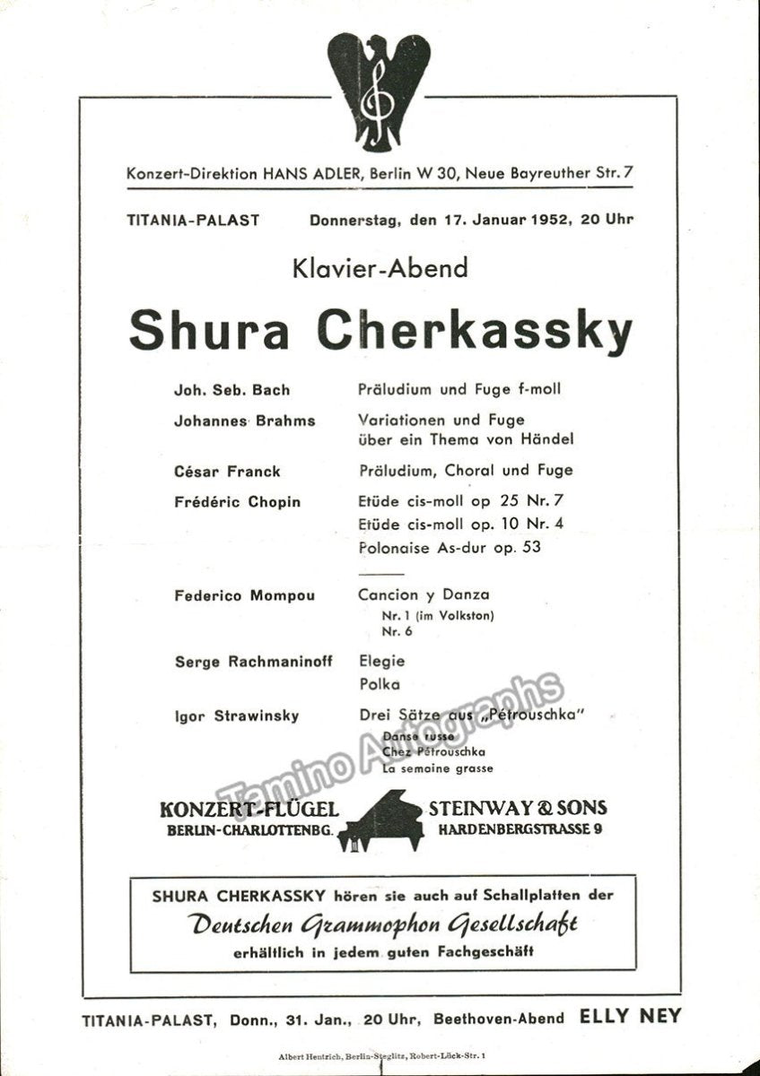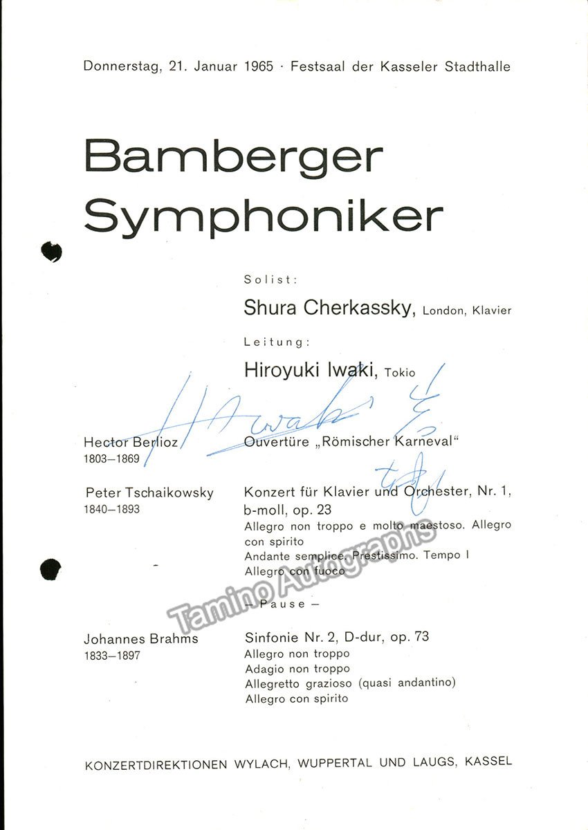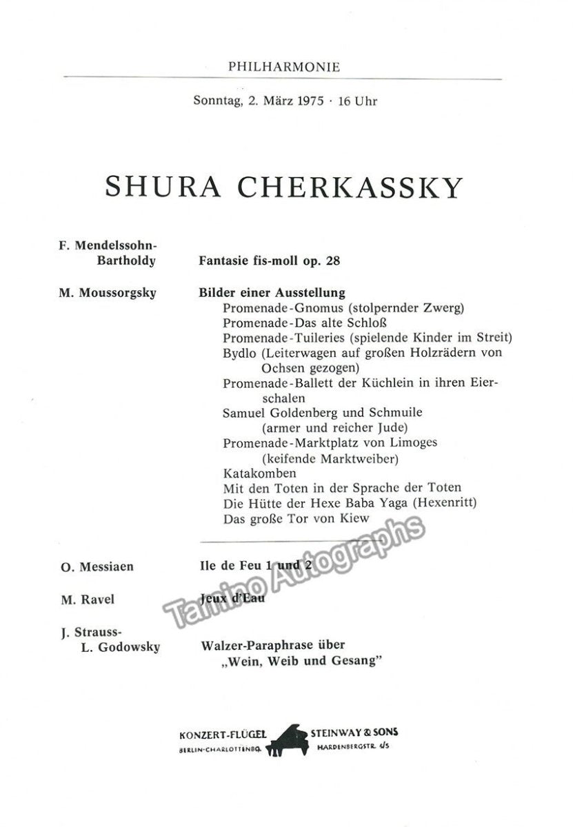 Group of 5 programs, each for a performance by pianist Shura Cherkassky, from 1952 through 1975. One program is signed by conductor Hiroyuki Iwaki. Different venues, each one sized approx. 6 x 8.25 inches, in excellent condition. See scans.