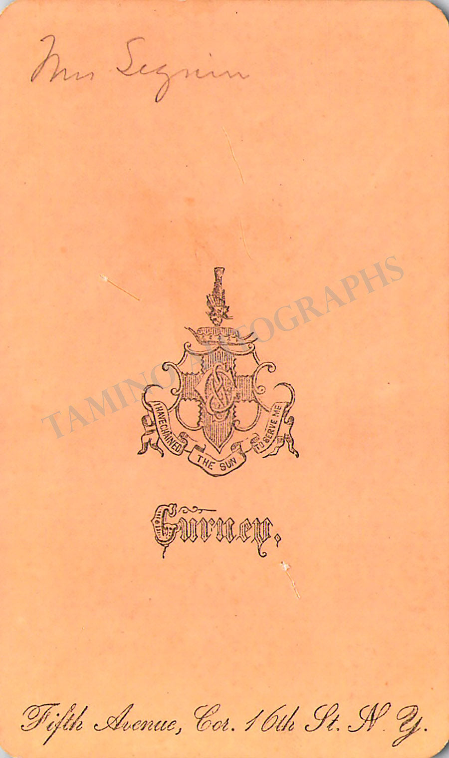 British-American soprano (1811-1888), part of the Seguin Troupe which performed opera in English throughout America. Unsigned Carte-de-Visite (CDV) of the artist, shown as herself, by J. Gurney and Son photographers, New York. Size is 2.4 x 4.1 inches, in excellent condition.