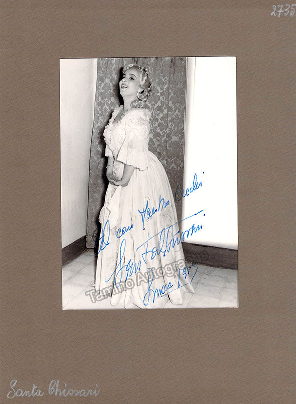 Italian soprano, signed photograph, shown in role, dated in Lucca in 1959.  This is a 4 x 5.75 inch photo mounted onto soft cardboard, total item size is 7 x 9.5 inches, in excellent condition.