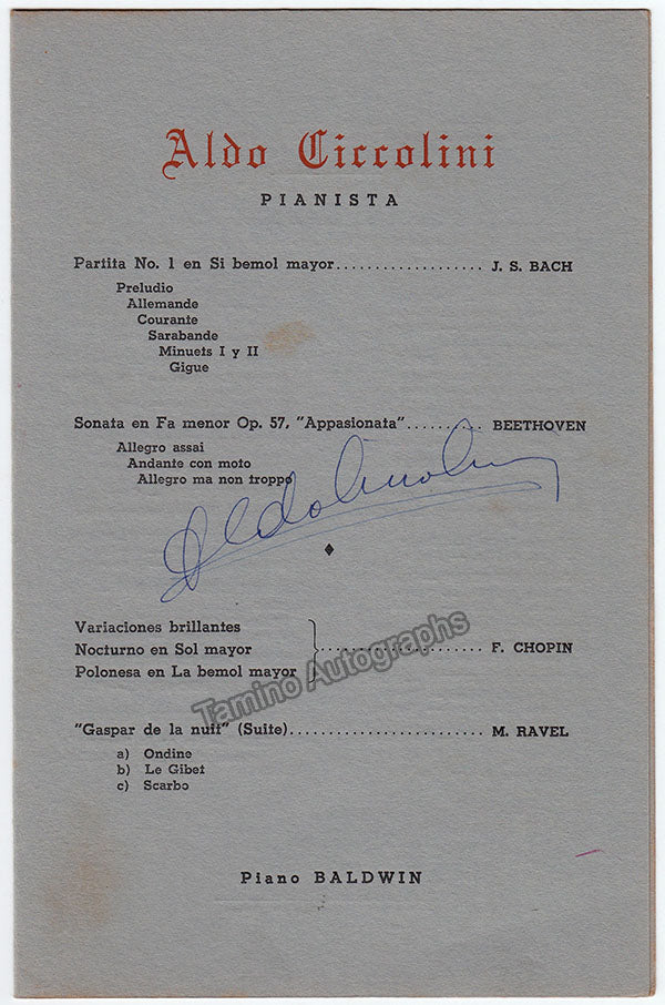 Program for a performance of the Italian-French pianist at Sociedad ProArte Musical, Havana, Cuba, on November 15th, 1950, signed by him on the program page.  Size is 5.6 x 8.6 inches, minor rust stains, in excellent condition.
