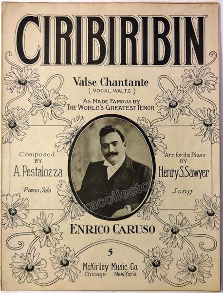Score for the valse chantante Ciribiribin by A. Pestalozza, made famous by Enrico Caruso. Score shows a photo of the great tenor on front page, and is complete, with all 6 pages (including covers). Published by McKinley Music Co., 10.25 x 13.25 inches, circa 1915, unsigned, in very good condition.