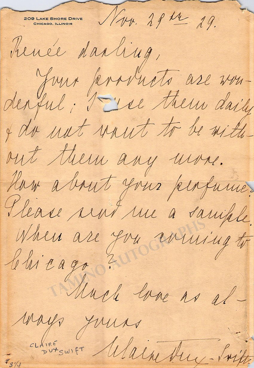 Two autograph letters signed. 1 page each, written in English, both signed as "Claire Dux-Swift". The older of the two letters dated in 1929 is 5.5 x 8.25 inches on slightly faded paper with a small bullet hole in one line of the text but otherwise in good condition. Another letter dated in 1933 is inscribed to Leo Riemens, 5.75 x 7.75 inches, in excellent condition.