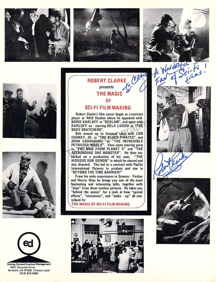 American actor (1920-2005), best known for his cult classic science fiction films in the 1950s; active between 1944 and 2005.  Signed flyer promoting a talk entitled "The Magic of Sci-Fi Film Making", inscribed with a short sentiment.  Size is 8.5 x 11 inches, 1 page printed on both sides, in excellent condition.