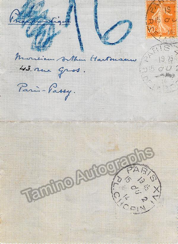 Size is 4.25 x 6 inches, verso was used to mail this note to Hartmann, a translation from the original French is provided. In excellent condition.
