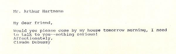 Short handwritten and signed note by the famous French composer (1862-1918), inviting a friend (Arthur Hartmann) to his house, dated in Paris in 1914. Hartmann was an American violinist and composer (1881-1956), a close friend of Debussy for many years, and later wrote a biography of the French composer.