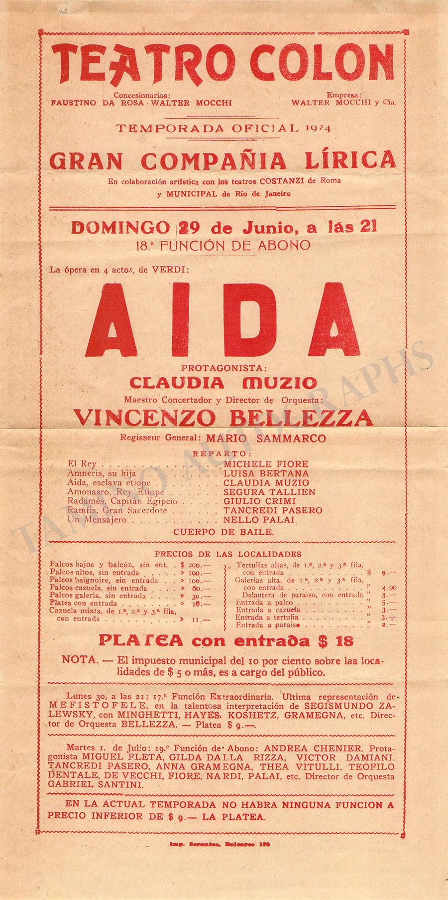 Fine playbill advertising the performance of Verdi's opera "Aida" at Teatro Colon, Buenos Aires, on June 29, 1924, starring Claudia Muzio and Tancredi Pasero under the baton of Vincenzo Bellezza, and Mario Sammarco as scene director.  Size is 6.9 x 13.75 inches, central fold, in very good condition.