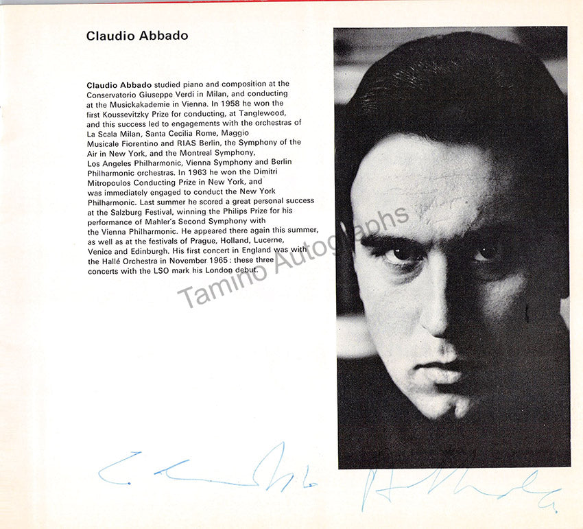 Program for a performance of the star Italian conductor Claudio Abbado conducting the London Symphony Orchestra at the Royal Festival Hall, London, on October 27th, 1966, signed by him on his bio page.
