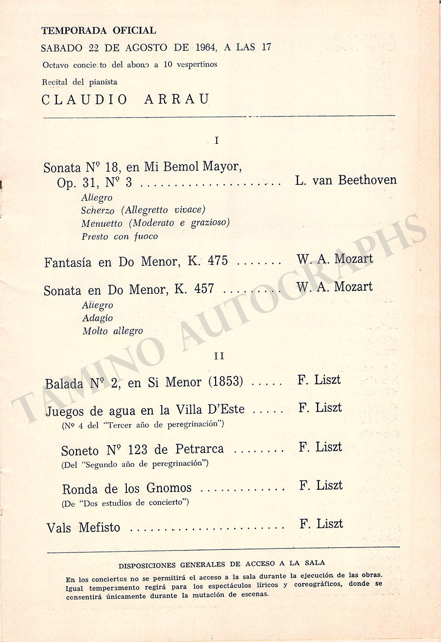 Arrau, Claudio - Concert Program Teatro Colon Buenos Aires 1964 Arrau, Claudio - Concert Program Teatro Colon Buenos Aires 1964