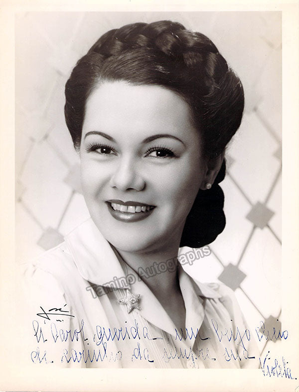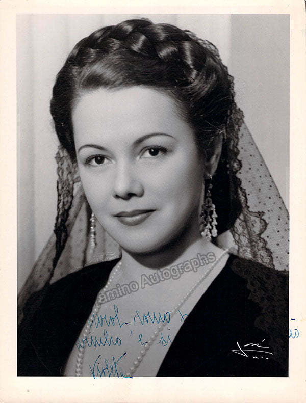 Signed photograph, shown as Massenet's Manon, inscribed, dated in Rio de Janeiro in 1987. Stamped on verso by Studio Jose photographers. Size is 7.25 x 9.25 inches, small creases and bends, otherwise in very good condition.