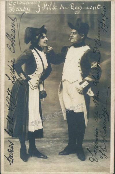 Double signed photo postcard of La Fille du Regiment, showing soprano Lydia Colbrant as Marie, and Bass Henri Hardy at the opera in Anvers, 3.5 x 5.25 inches. Signed by both singers, dated in 1910
