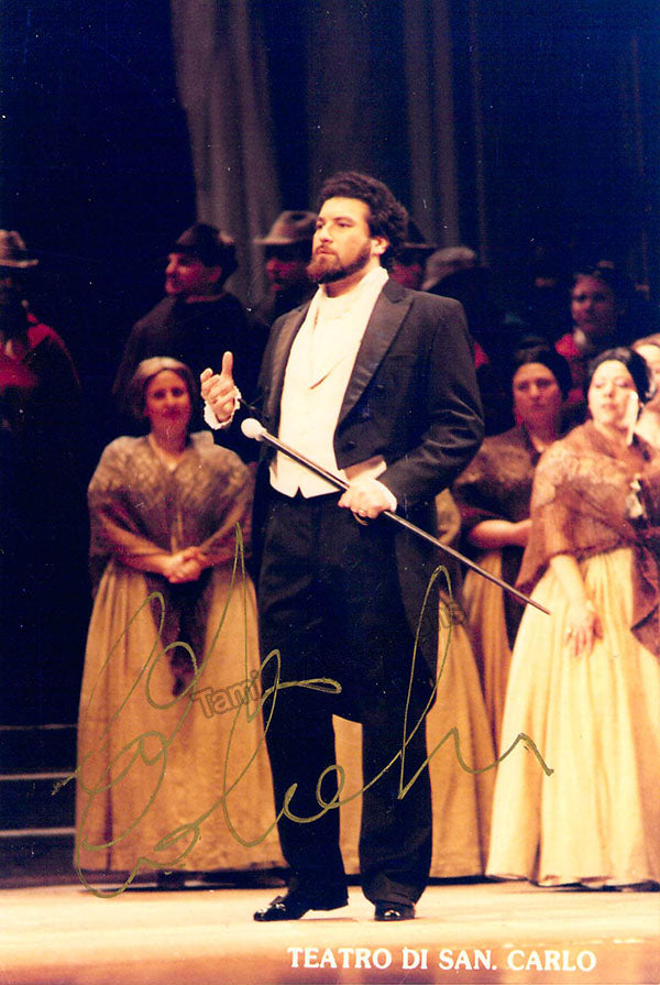 Italian bass (b. 1964), signed photograph, shown in role or possibly in a gala performance, at the Teatro Di San Carlo, Naples. Stamped on verso by photographer Enzo Conte, Naples. Size is 4 x 5.75 inches, in excellent condition.