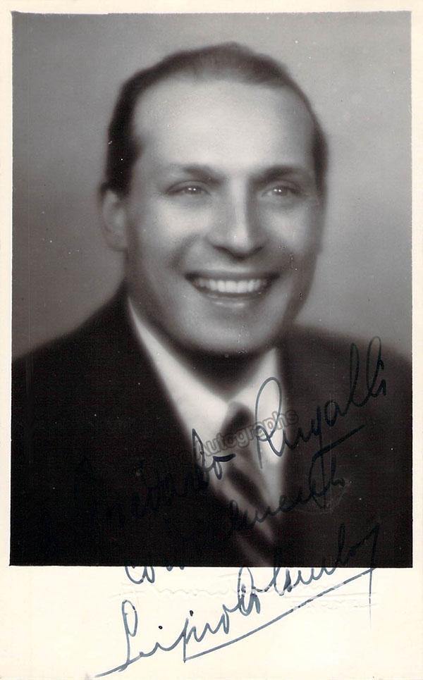 Italian baritone (1910-2002), signed photo, shown as himself. Inscribed. Blind stamped on front by photographer A. Montacchini, Parma. Size is 3.25 x 5.25 inches, in excellent condition.