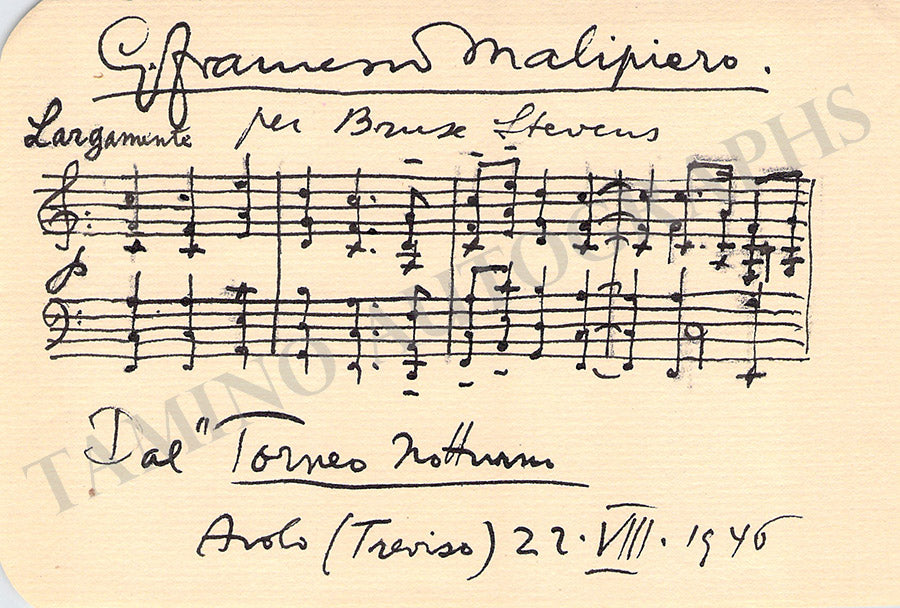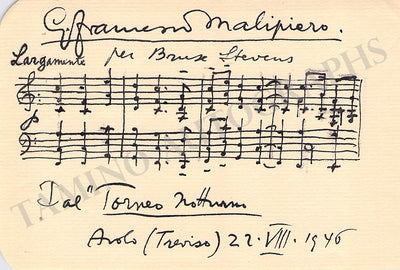 4-bar autograph music quote from his work Torneo Notturno signed and inscribed by him, dated in Treviso, 1946. Size is 5.75 x 4 inches, ink markings on verso, in excellent condition.