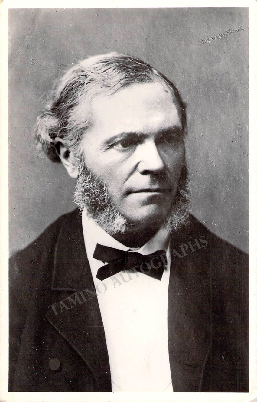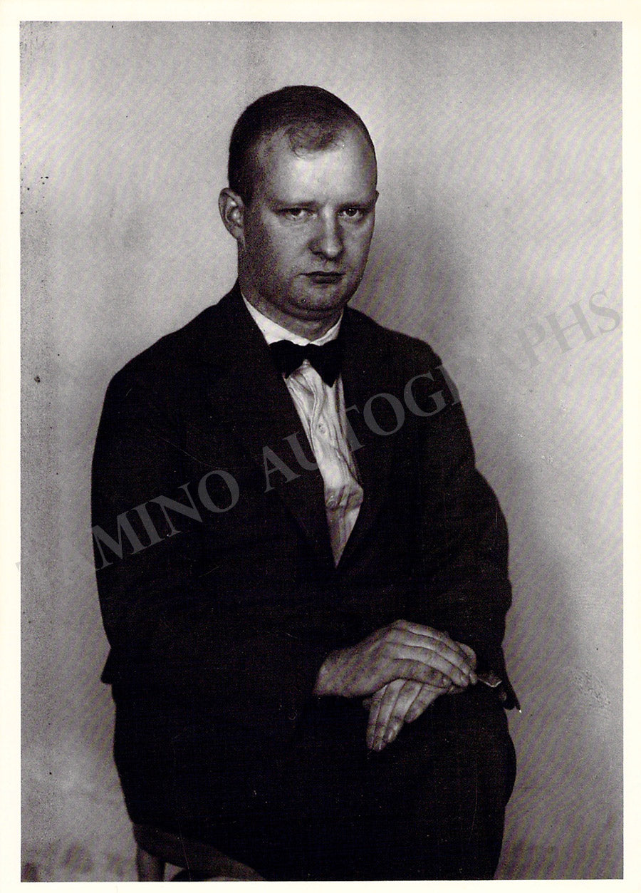 Fine black-and-white photo postcard of a portrait of the composer with printed text below. Jagged edges, some stains.