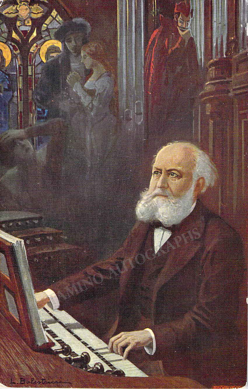 Fine modern color photo postcard of a drawing of the composer shown playing the organ.