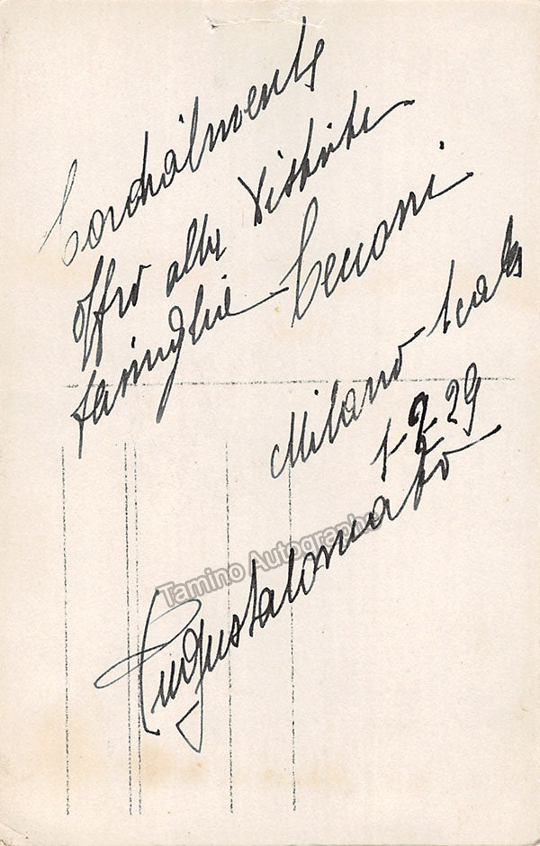 Italian soprano (1895-1964), signed publicity photograph, shown as herself. Signed and inscribed on verso, dated at La Scala, Milan in 1929. Size is 3.25 x 5.25 inches, very small crack at the top not affecting image and signature, otherwise in excellent condition.