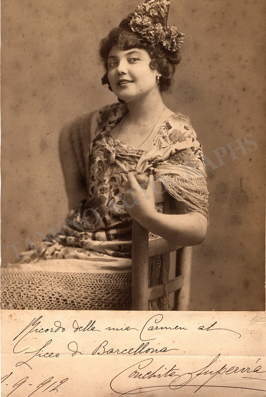 Star Spanish mezzo-soprano (1895-1936), very famous in her time in Europe and America, sadly died giving birth at age 40, and her autographs are quite rare.