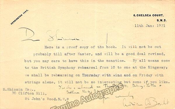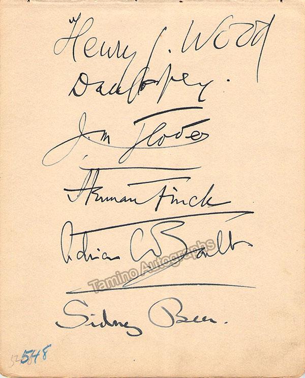 Lot of 10 signatures cut of different types (cut album pages, personal cards, signatures cut, typed letters) of conductors including Adrian Boulton, Brendan Bracken, Henry Wood, John Barbirolli, Malcom Sargent, Rafael Fruhbeck de Burgos and Thomas Beecham. Different sizes up to 7.8 x 5 inches, all in good condition. NOT SOLD INDIVIDUALLY.
