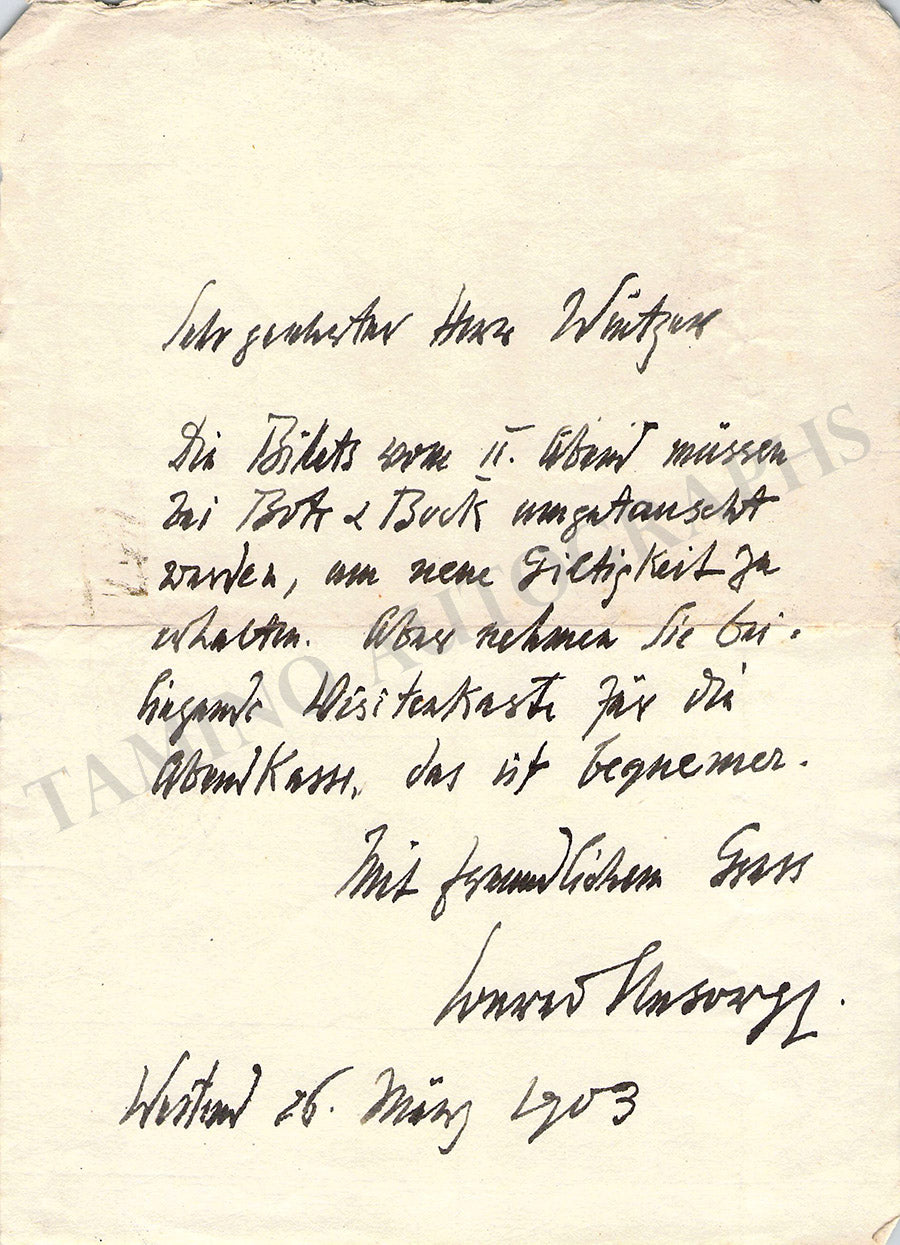 Autograph letter in German signed by him, dated March 26, 1903, to Mr. Würtzer in Berlin, concerning tickets for a concert: “…Die Bilets des II Abend müssen bei Bote und Buck umgetauscht werden, um neue Gultigkeit zu erhaben…”. (“…The billets of the II evening must be exchanged at Bote and Buck to get new validity…”)