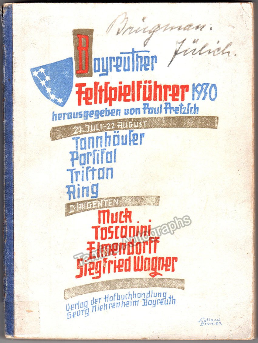 July 21st - Aug 22nd - Tannhäuser, Parsifal. Tristan. Ring. Dirigenten: Muck, Toscanini, Elmendorff, Siegfried Wagner. Festival guide of the Bayreuth Festival 1930. Portraits and biographies of all artists and complete program details of all performances, 386 pages, many photographs, some writing on the front cover, otherwise in very good condition.