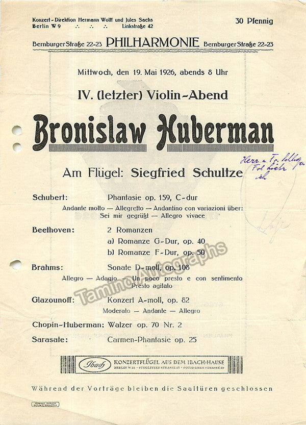 Huberman, Bronislaw - Signature + Playbill 1926