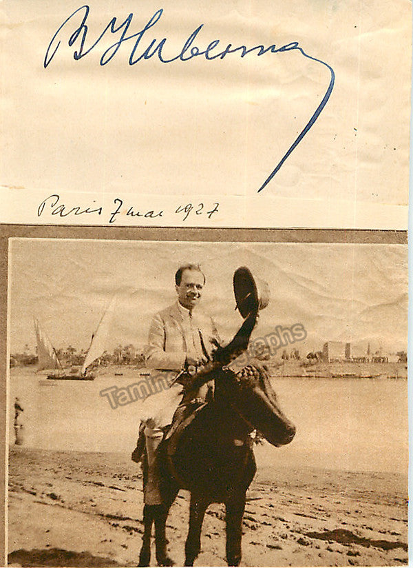 Also included is another Huberman signature, attached to a half-tone photo of him on a horse, dated by a different hand in Paris in 1927, size is 4 x 5.5 inches. See photos.