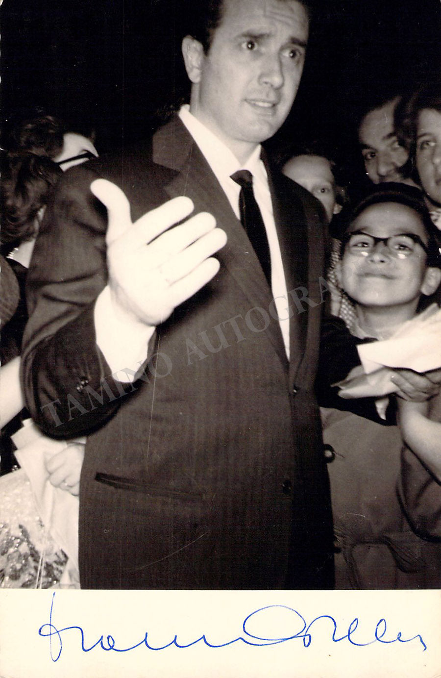 Signed photograph, shown as himself, dated in 1960. Printed signature on front of photographer Villiani, Bologna. Size is 4 x 5.75 inches, in excellent condition.