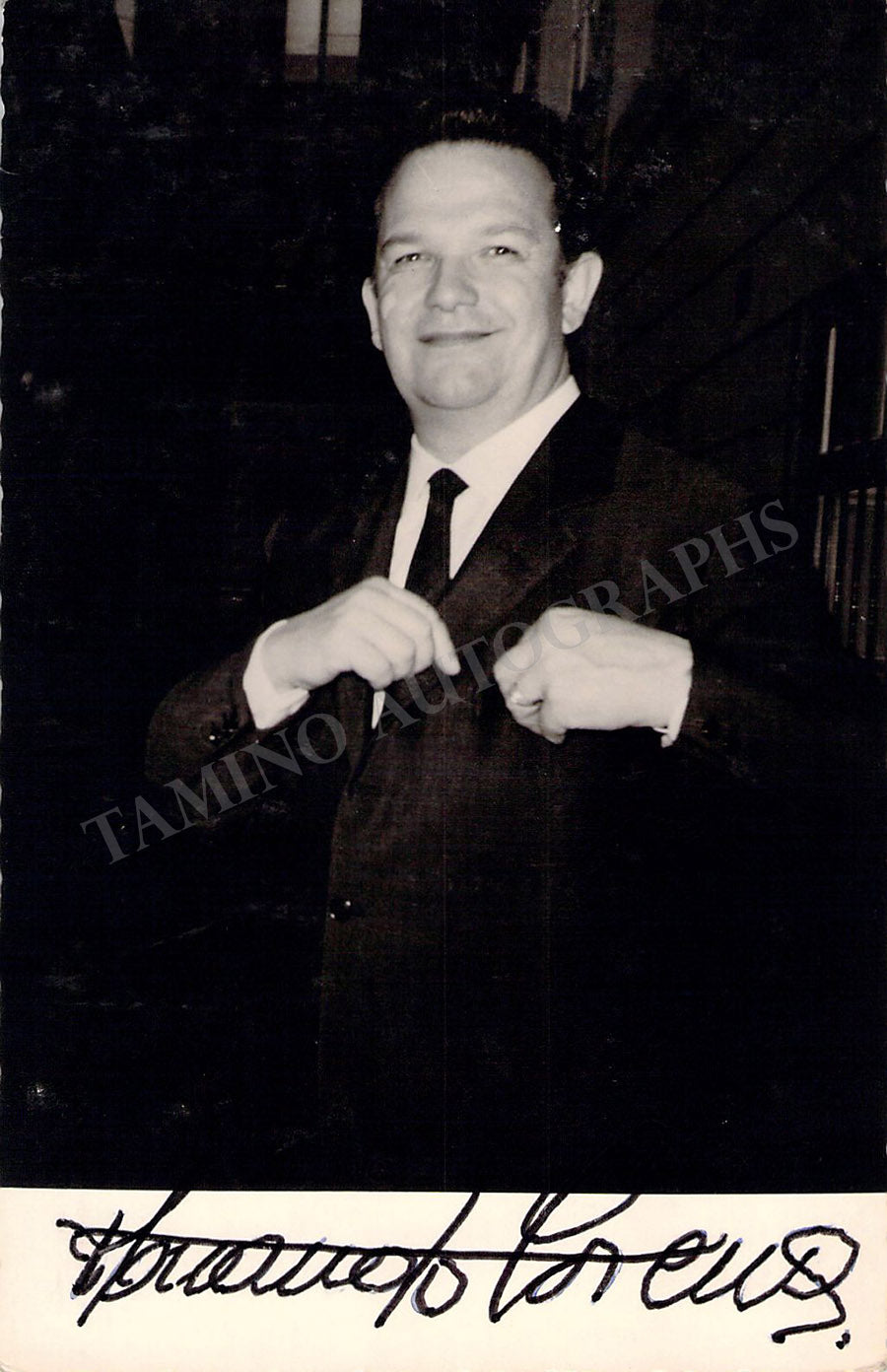 Fine black-and-white photograph signed and inscribed by him, dated 1963, shown as himself. Size is 8 x 10 inches, stains over borders, minor crack over the left border, otherwise in very good condition.