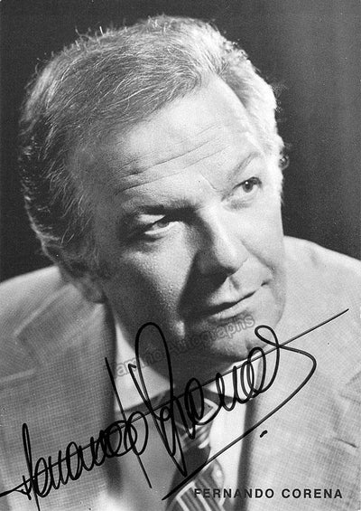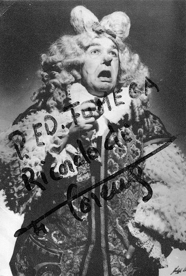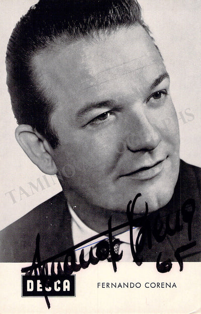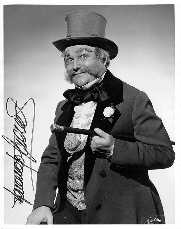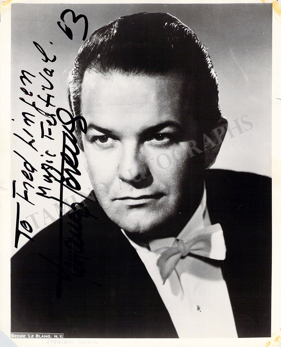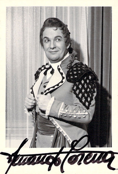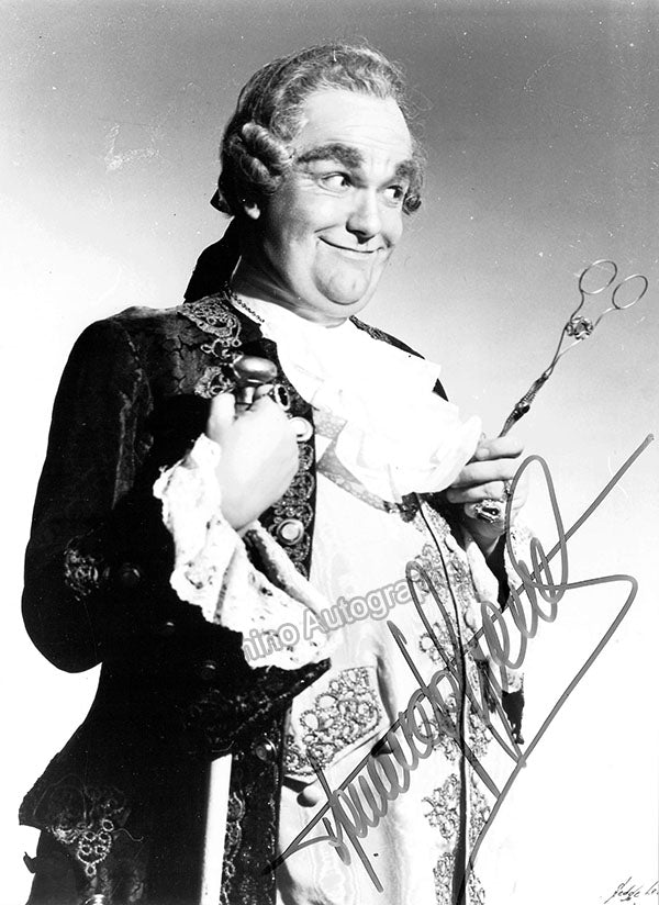 Signed photograph, shown in the title role of Verdi's Falstaff, dated in 1959. Blind stamped on front by photographer Villiani, Bologna. Size is 7 x 9.25 inches, in excellent condition.