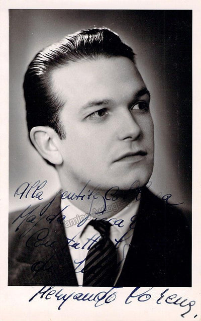 Signed photograph, shown as himself, inscribed and dated in 1954. Stamped on verso by photographer Villani, Bologna. Size is 6 x 7 inches, mounting tape traces on verso, otherwise in excellent condition.