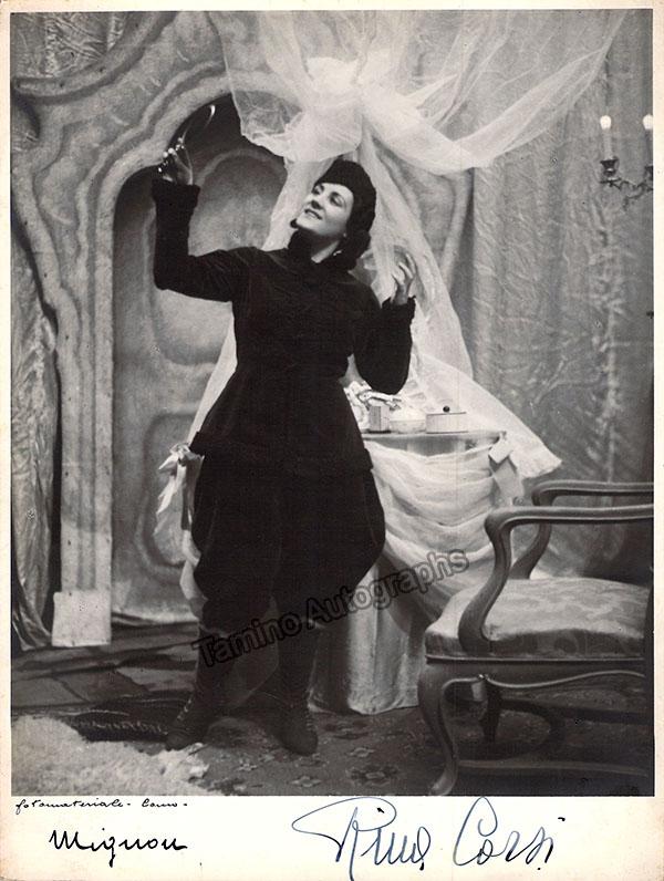Italian mezzo-soprano (1908-?), signed photo, shown in title role of Ambroise Thomas's Mignon. Stamped on verso by photo studio Fotomateriale, Como. Size is 7 x 9 inches, in very good condition.