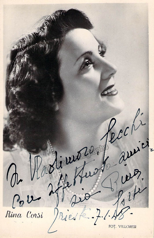 Italian mezzo-soprano (1908-?), signed photo postcard, shown as herself, inscribed in Trieste, dated in 1948. Stamped on front by photo studio Villoresi. Size is 3.5 x 5.5 inches, in very good condition.
